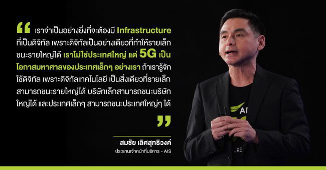 นายสมชัย กล่าวในตอนท้ายว่า “ชาวเอไอเอส พร้อมอย่างยิ่งที่จะนำ AIS 5G ที่ดีที่สุด เข้ามาเป็นเส้นเลือดใหญ่ดิจิทัลหลักของประเทศไทยจากวันนี้เป็นต้นไป เพราะวิกฤตโควิด-19 ที่เกิดขึ้นในช่วงที่ผ่านมาเป็นบทเรียนสำคัญของคนไทยและทั่วโลกว่า ท่ามกลางวิกฤตยังมีโอกาสอันยิ่งใหญ่อยู่เสมอ ขึ้นอยู่กับว่าเราจะฉกฉวยโอกาสนั้นอย่างไร โดยในส่วนของประเทศไทยนั้น ถือว่ามีจุดแข็งซึ่งได้รับการยอมรับจากทุกภาคส่วนว่า มีระบบสาธารณสุขที่เป็นเลิศ,มีแหล่งท่องเที่ยวธรรมชาติที่สวยงาม, เป็นแหล่งอาหารที่อุดมสมบูรณ์ และอื่นๆอีกมากมาย ดังนั้นเมื่อนำดิจิทัลอย่าง 5G เข้าไปผสมผสานในกระบวนการที่เกี่ยวข้องของภาคอุตสาหกรรมดังกล่าวข้างต้น ย่อมทำให้เป็นพลังช่วยพลิกฟื้นประเทศไทยให้ก้าวผ่านวิกฤตได้อย่างดีที่สุด ดังนั้นนอกจากการปรับตัวให้พร้อมรับกับสิ่งที่เกิดขึ้นแล้ว ผมยังอยากเชิญชวนทุกภาคส่วนให้เข้ามาร่วมในภารกิจฟื้นฟูประเทศ ขานรับกับนโยบาย “รวมไทยสร้างชาติ” ของรัฐบาลไปด้วยกันอีกด้วย”