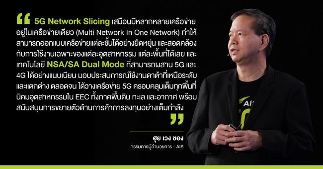 “ตลอดระยะเวลากว่า 30 ปี เอไอเอสได้ลงทุนมากกว่า 1.1 ล้านล้านบาท โดยในปีนี้ได้เตรียมงบลงทุนไว้ที่ 35,000-45,000 ล้านบาท ในการพัฒนาโครงสร้างพื้นฐานด้านดิจิทัลเพื่อคนไทยอย่างต่อเนื่อง โดยล่าสุดเอไอเอสเป็นผู้ให้บริการ Digital Life Service Provider ที่ถือครองคลื่นความถี่มากที่สุด คือ LOW BAND (700-900 MHz) 50 MHz, MID BAND (1800-2600 MHz) 170 MHz และ HIGH BAND (26 GHz) 1200 MHz และเปิดให้บริการ AIS 5G เป็นรายแรกของประเทศตั้งแต่วันที่ 21 กุมภาพันธ์ 2563 พร้อมขยายเครือข่ายไปครบทั้ง 77 จังหวัดเรียบร้อยแล้ว ตั้งแต่เดือนพฤษภาที่ผ่านมา”