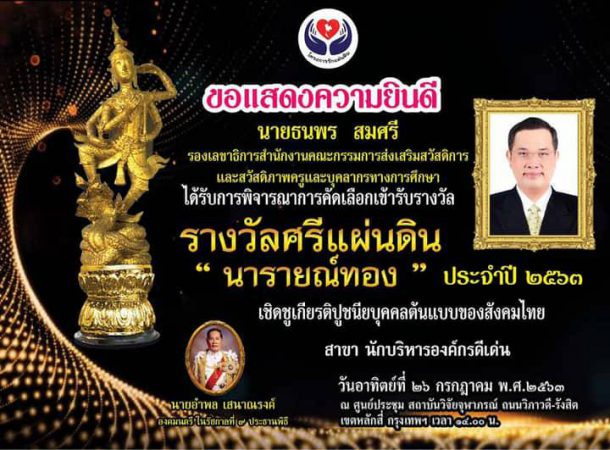 นายธนพร สมศรี เข้ารับ “รางวัลศรีแผ่นดิน “นารายณ์ทอง”ประจําปี 2563 ในงานเชิดชูเกียรติปูชนียบุคคลต้นแบบของสังคมไทย