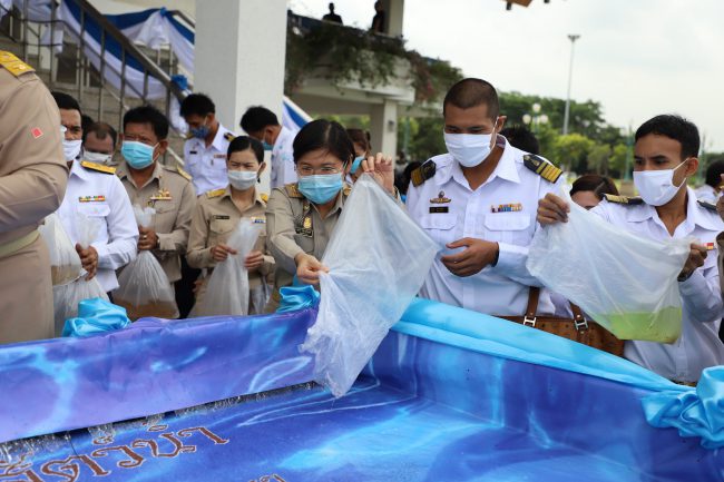 วันที่ 14 สิงหาคม 2563 ณ ท่าชัยยุทธ ศูนย์ศิลปาชีพบางไทร จังหวัดพระนครศรีอยุธยา นายภานุ แย้มศรี ผู้ว่าราชการจังหวัดพระนครศรีอยุธยา พร้อมคณะให้การต้อนรับ นายจรัลธาดา กรรณสูต องคมนตรี ประธานในพิธีปล่อยพันธุ์สัตว์น้ำ จำนวน 1 ล้านตัว เพื่อถวายพระราชกุศลฯ โดยมี นายมีศักดิ์ ภักดีคง อธิบดีกรมประมง เป็นผู้กล่าวรายงาน พร้อมด้วย หัวหน้าส่วนราชการ และเจ้าหน้าที่ ร่วมพิธีในครั้งนี้ โดยความร่วมมือของ กรมประมง ร่วมกับ จังหวัดพระนครศรีอยุธยา จัดพิธีภายใต้โครงการ “ปล่อยพันธุ์สัตว์น้ำ 39.5 ล้านตัว ใน 77 จังหวัด เพื่อถวายพระราชกุศลเนื่องในวันเฉลิมพระชนมพรรษาสมเด็จพระนางเจ้าสิริกิติ์ พระบรมราชินีนาถ พระบรมราชชนนีพันปีหลวง