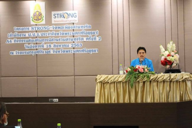 วันนี้ (19 ส.ค.63) ที่โรงแรมกรุงศรีริเวอร์ สำนักงาน ป.ป.ช. ประจำจังหวัดพระนครศรีอยุธยา ร่วมกับ ชมรม STRONG – จิตพอเพียงต้านทุจริตจังหวัดพระนครศรีอยุธยา จัดโครงการ STRONG – จิตพอเพียงต้านทุจริต กิจกรรมส่งเสริมการมีส่วนร่วมต้านทุจริต