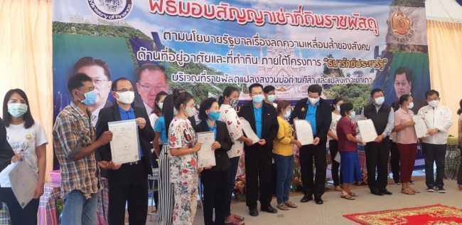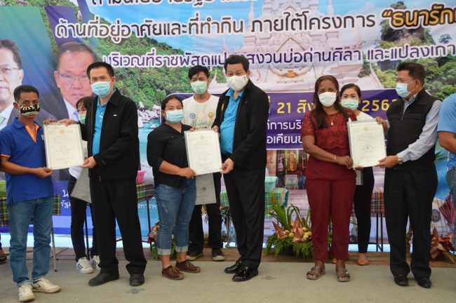 วันที่ 21 สิงหาคม 2563 นายยุทธนา หยิมการุณ อธิบดีกรมธนารักษ์ พร้อมด้วยนายธำรงค์ ทองตัน รักษาการในตำแหน่งที่ปรึกษาด้านพัฒนาการประเมินราคาอสังหาริมทรัพย์ นางสาวสุภัทรา ส่องประทีป ผู้อำนวยการกองพัฒนาธุรกิจและศักยภาพที่ราชพัสดุ และนายสมมาตร มณีหยัน ผู้อำนวยการกองเทคโนโลยีการสำรวจและฐานข้อมูลที่ราชพัสดุ ลงพื้นที่แจกสัญญาเช่าที่ดินราชพัสดุตามนโยบายเรื่องลดความเหลื่อมล้ำของสังคม ด้านที่อยู่อาศัยและที่ทำกิน ภายใต้โครงการ “ธนารักษ์ประชารักษ์” พร้อมจัดตลาดชุมชน ภายใต้โครงการ “เปลี่ยนชุมชน เป็นห้องประชุม ในที่ราชพัสดุ” ตามแนวทางการขับเคลื่อนการพัฒนาเศรษฐกิจฐานรากอย่างยังยืน ในการนี้ นายจงภัก ใจดี ธนารักษ์พื้นที่สุราษฎร์ธานี นายถาวร บุญพุฒ ธนารักษ์พื้นที่พังงา และนายอดุลย์ จูเมฆา ธนารักษ์พื้นที่กระบี่ ให้การต้อนรับ