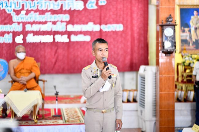 พระเทพศาสนาภิบาล ประธานคณะกรรมการขับเคลื่อนโครงการ “หมู่บ้านรักษาศีล ๕” ส่วนกลาง วัดไร่ขิง พระอารามหลวง พร้อมด้วยคณะกรรมการขับเคลื่อน