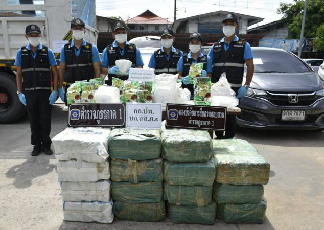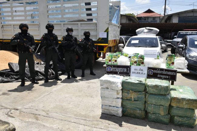 วันนี้ (วันศุกร์ที่ 11 ก.ย.63) เวลา 13.00 น. พล.ต.อ.สุชาติ ธีระสวัสดิ์ รอง ผบ.ตร. (ปป) พร้อมด้วย พล.ต.ท.อำพล บัวรับพร ผบช.ภ.1, พล.ต.ต.นพดล ศรสำราญ รอง ผบช.ภ.1 และ พล.ต.ต.สุศักดิ์ ปรักกมะกุล ผบก.ภ.จว.พระนครศรีอยุธยา ร่วมแถลงข่าวจับกุมนายทวีชัยหรืออ๋า บุญพันธ์ กับพวกรวม 3 คน พร้อมของกลางยาไอซ์หรือเมทแอมเฟตามีน จำนวน ๑๘ กระสอบ น้ำหนักรวมประมาณ ๔๙๓ กิโลกรัม ซุกซ่อนอยู่ในข้าวโพดอาหารสัตว์ที่บรรทุกมาบริเวณกระบะหลังของรถบรรทุกสิบล้อดำเนินคดีในความผิดฐาน ร่วมกันมียาเสพติดให้โทษประเภท ๑ (เมทแอมเฟตามีน) ไว้ในความครอบครองเพื่อจำหน่ายโดยผิดกฎหมาย พร้อมทั้งรถทั้ง ๓ คัน รวมมูลค่าประมาณ ๑,๕๐๐,๐๐๐ บาท เป็นของกลาง