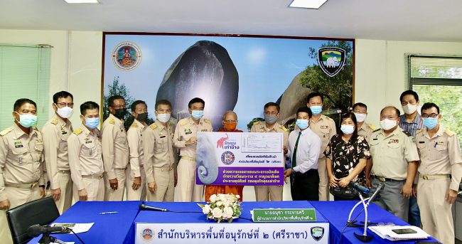 ที่สำนักบริหาร พื้นที่อนุรักษ์ที่ 2 (ศรีราชา) จ.ชลบุรี พระอาจารย์ชายกลาง อภิญาโณ ตัวแทนพระธรรมบัณฑิต เจ้าอาวาสวัดพระราม 9 กาญจนาภิเษก ประธานอุปถัมภ์ กองทุนรักคุณเท่าช้าง มอบสินไหมทดแทนแก่ นายสัญญา แซ่จู ทายาทผู้รับผลประโยชน์ นายสัญชัย แซ่จู อาสาสมัครพิทักษ์ช้างป่า อ.แก่งหางแมว จ.จันทบุรี ที่ประสบอุบัติเหตุเสียพร้อมภรรยา