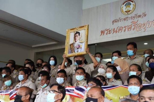 วันนี้ (8 ตุลาคม 2563) นายภานุ แย้มศรี ผู้ว่าราชการจังหวัดพระนครศรีอยุธยา มอบหมายให้ นายสมศักดิ์ เจริญไพฑูรย์ ปลัดจังหวัดพระนครศรีอยุธยา เป็นผู้แทนรับหนังสือจาก ชมรมกำนันผู้ใหญ่บ้าน นำโดย นายธวัชชัย นิมา ประธานชมรมกำนัน ผู้ใหญ่บ้าน ฯลฯ จังหวัดพระนครศรีอยุธยา พร้อมด้วย กำนัน ผู้ใหญ่บ้าน ฯลฯ จำนวนกว่า 500 คน ซึ่งร่วมกันเข้ายื่นหนังสือเพื่อแสดงจุดยืนปกป้องสถาบันสำคัญของชาติ ที่บริเวณหน้าศาลากลางจังหวัดพระนครศรีอยุธยา จังหวัดพระนครศรีอยุธยา