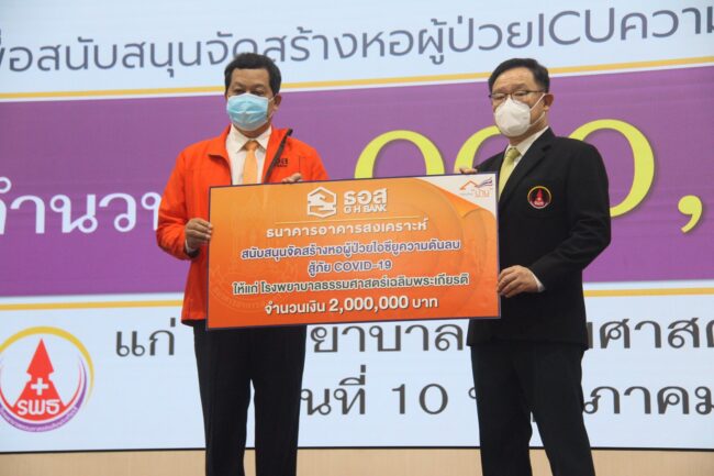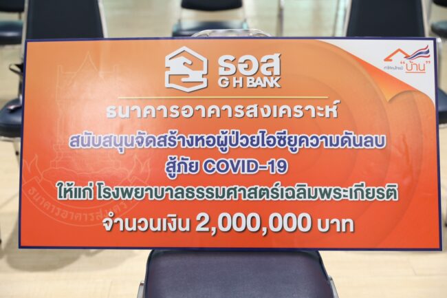 ได้อย่างเต็มศักยภาพ และเพียงพอต่อการรองรับจำนวนผู้ป่วยที่เพิ่มสูงขึ้น ธอส.ในฐานะสถาบันการเงินเฉพาะกิจของรัฐที่มีพันธกิจ “ทำให้คนไทยมีบ้าน” ได้ตระหนักถึงการแสดงความรับผิดชอบต่อสังคม และสิ่งแวดล้อม จึงได้ร่วมสนับสนุนงบประมาณสู้ภัย COVID-19 จำนวนดังกล่าว มอบให้แก่ โรงพยาบาลธรรมศาสตร์เฉลิมพระเกียรติ สำหรับจัดสร้างหอผู้ป่วยไอซียูความดันลบแบบห้องแยกที่ใช้รักษาผู้ป่วยวิกฤติที่มีอาการรุนแรง ซึ่งถือว่าเป็นส่วนหนึ่งของการสนับสนุนช่วยเหลือสังคมไทยสู้ภัย COVID-19 ที่ธนาคารดำเนินการมาอย่างต่อเนื่อง อาทิ ส่งมอบหน้ากากอนามัย พร้อมสายคล้องหน้ากากอนามัย จำนวน 10,420 ชุด ให้แก่กระทรวงการพัฒนาสังคมและความมั่นคงของมนุษย์ เพื่อนำไปแจกจ่ายให้กับประชาชนในชุมชน อีกทั้งในด้านงบสนับสนุนน้ำดื่ม และอาหารกลางวันให้หน่วยงานสำคัญต่างๆ สถานพยาบาล สถานศึกษา และวัด เป็นต้น