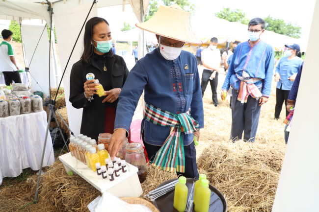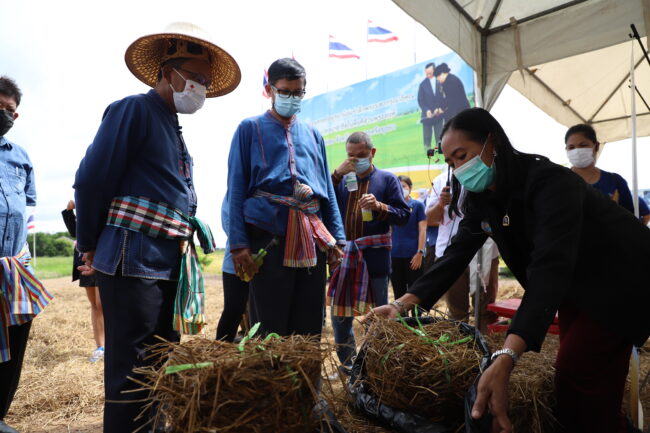 ด้าน นายไพฑูรย์ รื่นสุข กล่าวว่า โครงการส่งเสริมการดำเนินงานตามหลักปรัชญาเศรษฐกิจพอเพียง และขยายผลโครงการอันเนื่องมาจากพระราชดำริ เพื่อพัฒนาการผลิตข้าวในพื้นที่แปลงนาทุ่งมะขามหย่อง ได้ดำเนินการจัดทำแปลงสาธิตการผลิตเมล็ดพันธุ์ข้าว พันธุ์ กข43 โดยเริ่มปลูกข้าวเมื่อวันที่ 1 มิถุนายน 2564 และได้นำเทคโนโลยีมาใช้ควบคู่กับการจัดการศัตรูพืชแบบผสมผสานตลอดฤดูกาลผลิต ขณะนี้ข้าวในแปลงนา มีอายุครบ 97 วัน ซึ่งเป็นระยะที่เหมาะสมต่อการเก็บเกี่ยวข้าว จึงได้ดำเนินการจัดงาน “สืบสานคุณค่า วิถีชาวนาไทย” ระหว่างวันที่ 8 – 9 กันยายน 2564 โดยกิจกรรมในวันนี้เป็นการจำลองประเพณีการลงแขกเกี่ยวข้าวมาให้ผู้มีเกียรติทุกท่านได้มีส่วนร่วม เพื่อเป็นการอนุรักษ์วัฒนธรรม วิถีชาวนาไทย โดยผลผลิตที่ได้จากการเก็บเกี่ยวส่วนหนึ่งจะนำมาใช้ในกิจกรรมวันที่ 9 กันยายน 2564 ในพิธีรับขวัญพระแม่โพสพ ต่อไป