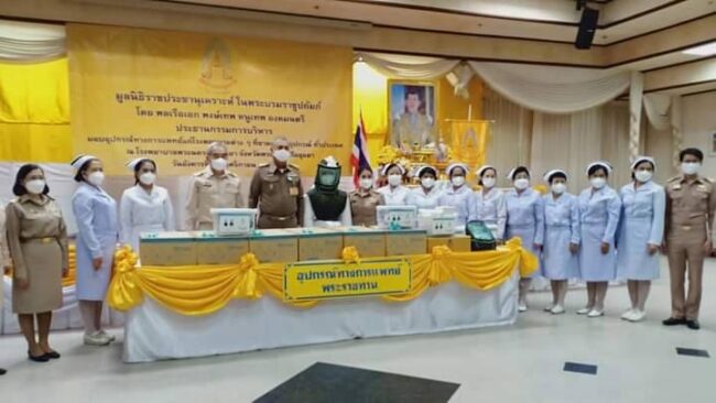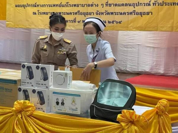 ประกอบด้วย มอบหน้ากากป้องกันเชื้อโรคแบบคลุมศรีษะพร้อมชุดกรองอากาศประสิทธิภาพสูง (PAPR) ให้แก่ โรงพยาบาลพระนครศรีอยุธยา จำนวน 20 ชุด โรงพยาบาลวังน้อย 6 ชุด โรงพยาบาลเสนา 10 ชุด และมอบเครื่องกำจัดเชื้อโรคแบบพกพา (SAF) ให้แก่ โรงพยาบาลบางปะอิน จำนวน 10 เครื่อง และโรงพยาบาลบางปะหัน 10 เครื่อง ยังความปลื้มปีติ แก่บุคลากรทางการแพทย์ และเจ้าหน้าที่ ต่างล้วนน้อมสำนึกในพระมหากรุณาธิคุณอันหาที่สุดมิได้