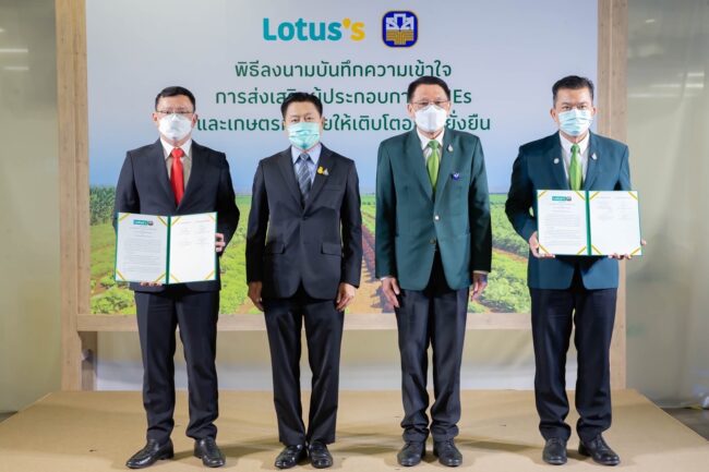 โลตัส และ ธนาคารเพื่อการเกษตรและสหกรณ์การเกษตร (ธ.ก.ส.) ลงนามบันทึกความเข้าใจ (MoU) ร่วมกัน สร้างความแข็งแกร่งให้เกษตรกรและผู้ประกอบการ SME ที่เป็นเครือข่ายลูกค้าของ ธกส. ส่งเสริมองค์ความรู้และนวัตกรรม ยกระดับมาตรฐานการผลิต เพิ่มมูลค่าสินค้า พร้อมบริการด้านการเงิน เสริมสร้างศักยภาพให้กับผู้ประกอบการ SME และเกษตรกรได้ต่อยอดพัฒนาผลิตภัณฑ์ เพิ่มโอกาสทางการตลาดผ่านช่องทางการจำหน่ายสินค้าของโลตัส ทั้งออนไลน์ และสาขากว่า 2,100 รวมถึงโอกาสในการส่งออกสินค้าไทยไปต่างประเทศ โดยมีโลตัสเป็น ‘แพลทฟอร์มแห่งโอกาส’