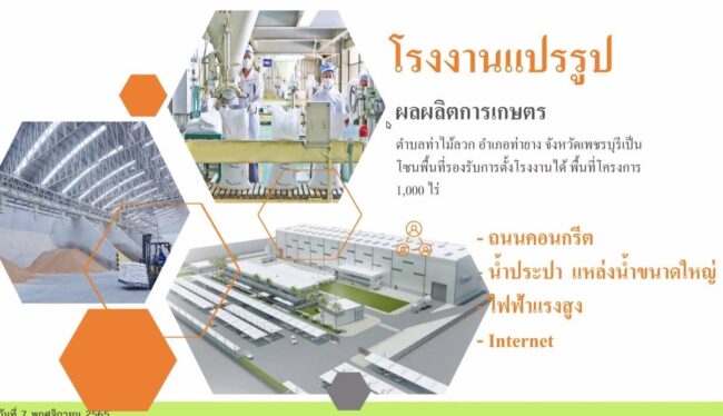 5. โรงงานแปรรูป 1,000 ไร่ ในพื้นที่ตำบลไม้รวก อำเภอท่ายาง เป็นโซนพื้นที่รองรับการตั้งโรงงานแปรรูปผลผลิตการเกษตร ซึ่งมีความพร้อมทั้งถนนคอนกรีต น้ำประปา แหล่งน้ำขนาดใหญ่ ไฟฟ้าแรงสูง รวมถึง Internet