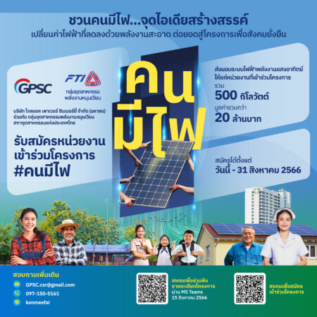 GPSC ร่วมกับ กลุ่มอุตสาหกรรมพลังงานหมุนเวียน สภาอุตสาหกรรมแห่งประเทศไทย จัดโครงการ “คนมีไฟ” เพื่อติดตั้งระบบผลิตไฟฟ้าพลังงานแสงอาทิตย์ ฟรี!!!! มูลค่ารวมกว่า 20 ล้านบาท