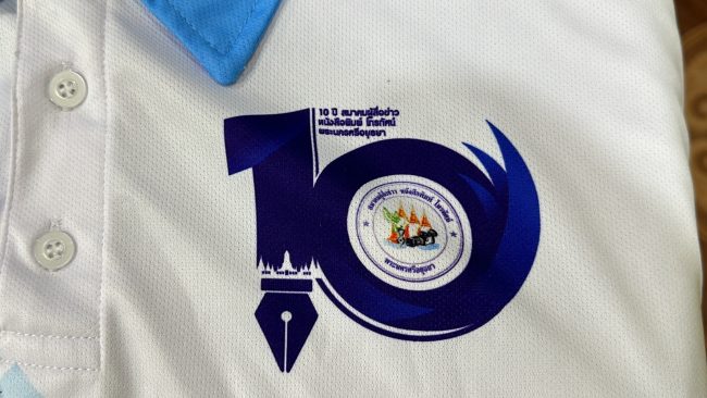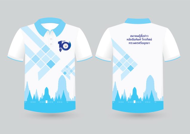 สำหรับเสื้อ ครบรอบ 10 ปี ของสมาผู้สื่อข่าวหนังสือพิมพ์ โทรทัศน์ พระนครศรีอยุธยา จะมี ลวดลายของโบราณสถานและวัดที่สำคัญ และลายปลาตะเพียนใบลาน พิมพ์อยู่บนตัวเสื้อ ซึ่ง ในปี 2566 กระทรวงวัฒนธรรม ได้ประกาศให้ปลาตะเพียนใบลาน ประกาศขึ้นบัญชีมรดกภูมิ ปัญญาทางวัฒนธรรม ระดับชาติ และปลาตะเพียนสานจึงเป็นของมงคล เป็นสัญลักษณ์ของ ความโชคดี เชื่อกันว่าบ้านใครแขวนปลาตะเพียนสาน จะมีความรุ่งเรือง ค้าขายร่ำรวย ส่วนโลโก้ครบรอบ 10 ปีของสมาคม ที่อยู่บริเวณหน้าอกของเสื้อ ตัวเลข 1 เป็นด้ามของปากกา และหัวของนกพิราบ สื่อถึงนักข่าวหรือสื่อมวลชนที่เขียนข่าวรายงานข่าว ตัวเลขศูนย์เป็นตัวและหางของนกพิราบมีความหมายของการสื่อสารอย่างอิสระ ล้อมรอบโลโก้ของสมาคมผู้สื่อข่าว
