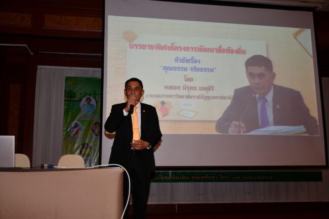 จากนั้น พล.อ.นิรุทธ เกตุสิริ นายกสภามหาวิทยาลัยราชภัฎอุบลราชธานี ได้ปาฐกถาพิเศษ เรื่อง คุณธรรม จริยธรรม และมอบโล่ประกาศเกียรติคุณ “คุณธรรม ศรีอีสาน ประจำปี 2567” ให้แก่บุคคล และองค์กร ที่คณะกรรมการพิจารณาได้ทำการคัดสรร สำหรับรางวัล “คุณธรรม ศรีอีสาน ตั้งแต่ปี 2561 เป็นต้นมา โดยมีวัตถุประสงค์ เพื่อเชิดชู ยกย่อง บุคคล องค์กร ที่ประกอบคุณงาม ความดี เสียสละ มีจิตสำนึกที่ดี รู้สึกรับผิดชอบ ชั่ว ดี เกรงกลัวต่อการกระทำความชั่ว ไม่ยุ่งเกี่ยวกับอบายมุข และสิ่งผิดกฎหมาย เป็นที่ยอมรับของสังคม โดยไม่ได้จำกัดเฉพาะผู้ประกอบอาชีพสื่อสารมวลชนเท่านั้น แต่ต้องมีภูมิลำเนา หรือประกอบกิจกรรมในพื้นที่ภาคอีสาน โดยสมาคมฯ จะมีการแต่งตั้งคณะกรรมการขึ้นมาชุดหนึ่ง เพื่อพิจารณาคัดเลือก บุคคล และองค์กร เข้ารับโล่รางวัล โดยไม่มีการเรียกร้องค่าใช้จ่าย หรือรับเงินบริจาค แต่อย่างใด