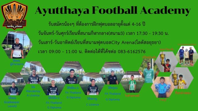 เพื่อสานฝันและผลักดันเยาวชน ทางอยุธยาฟุตบอล อะคาเดมี ได้นำโค้ชระดับมืออาชีพ โค้ช WANDERLEY MACHADO DA SILVA JUNIOR เป็นโค้ชที่เคยฝึกสอนหลายๆ สโมสร หลาย ๆ ทีม อย่างเช่น ทีม Persipura ทีม Badak Lampung และทีม นครศรี ยูไนเต็ต ซึ่งมีฝีมือระดับอาชีพ เข้าฝึกทักษะ และเสริมskill ให้กับน้องๆ เยาวชนของอยุธยาฟุตบอล อะคาเดมี่ อย่างต่อเนื่อง หากน้องๆ เยาวชน รวมทั้งผู้ปกครองที่สนใจอยากให้บุตรหลานของท่านฝึกเรียนรู้เรื่องฟุตบอล ติดต่อสอบถามได้ที่ 083 6162576 (โค้ชต่อ)