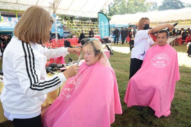 ในการนี้ รองศาสตราจารย์ ดร.ประมุข อุณหเลขกะ อธิการบดีมหาวิทยาลัยเทคโนโลยีราชมงคลสุวรรณภูมิ ได้มอบหมายให้ผู้ช่วยศาสตราจารย์ ดร.ภาสพิรุฬห์ วัชรศรีสำเริง รองอธิการบดี พร้อมด้วย ดร.ศิวัตม์ พลอินทร์ รองผู้อำนวยการสถาบันวิจัยและพัฒนา นำนักศึกษานวัตกรจิตอาสาเข้าร่วมโครงการบริการวิชาการและถ่ายทอดเทคโนโลยี และในครั้งนี้ มหาวิทยาลัยเทคโนโลยีราชมงคลสุวรรณภูมิ ได้มอบรถเข็นสำหรับผู้ป่วย จำนวน 5 คัน ซึ่งเป็นผลงานของนักศึกษาคณะครุศาสตร์อุตสาหกรรม พร้อมทั้งให้บริการตัดผมฟรีทั้งชายและหญิง โดยคณะวิศวกรรมศาสตร์และสถาปัตยกรรมศาสตร์ มีผู้มาใช้บริการจำนวน 120 คน